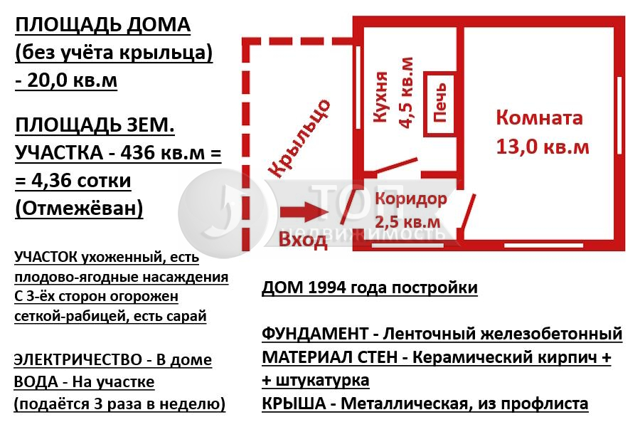 ПЛОЩАДЬ ДОМА (без учёта крыльца): 20,0 кв.м (комната 13,0 кв.м, кухня 4,5 кв.м, коридор 2,5 кв.м) + крыльцо.