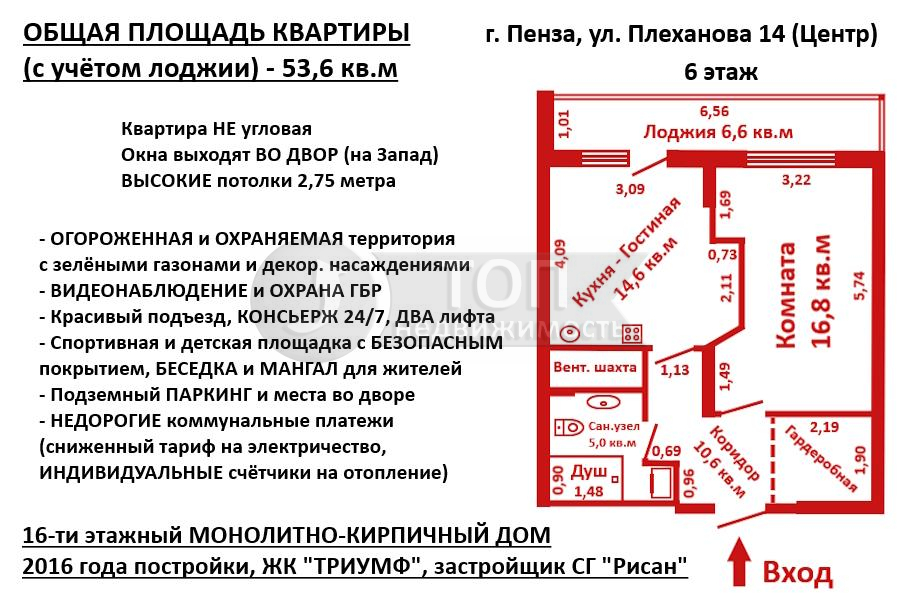 ОБЩАЯ ПЛОЩАДЬ КВАРТИРЫ (с учётом лоджии): 53,6 кв.м (кухня-гостиная 14,6 кв.м, комната 16,8 кв.м, коридор 10,6 кв.м, сан. узел совмещенный 5,0 кв.м, лоджия 6,6 кв.м).