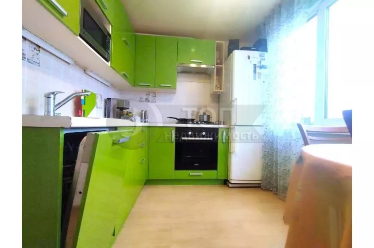 Напротив входа расположено сердце любой квартиры - кухня (7 кв. м.), оснащенная по последним веяниям моды: кухонным гарнитуром, обеденной зоной, кроме того здесь размещен холодильник, духовой шкаф, варочная поверхность, вытяжка, СВЧ и ПОСУДОМОЕЧНАЯ машина.