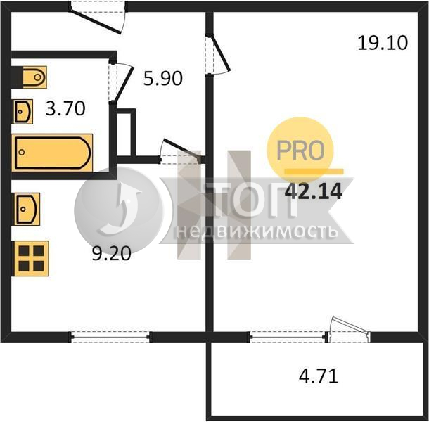 общая площадь - 42,14 кв. м.,
