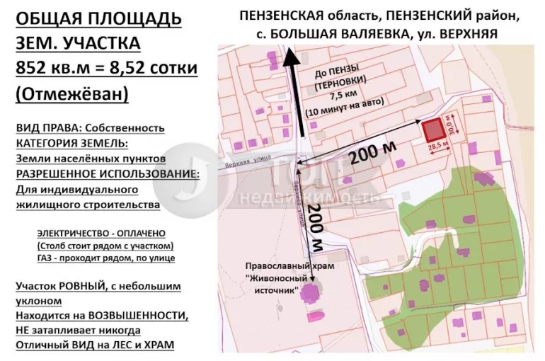 Продается УЧАСТОК 8,5 соток рядом с ЛЕСОМ и ХРАМОМ, в с. БОЛЬШАЯ ВАЛЯЕВКА, ул. ВЕРХНЯЯ
